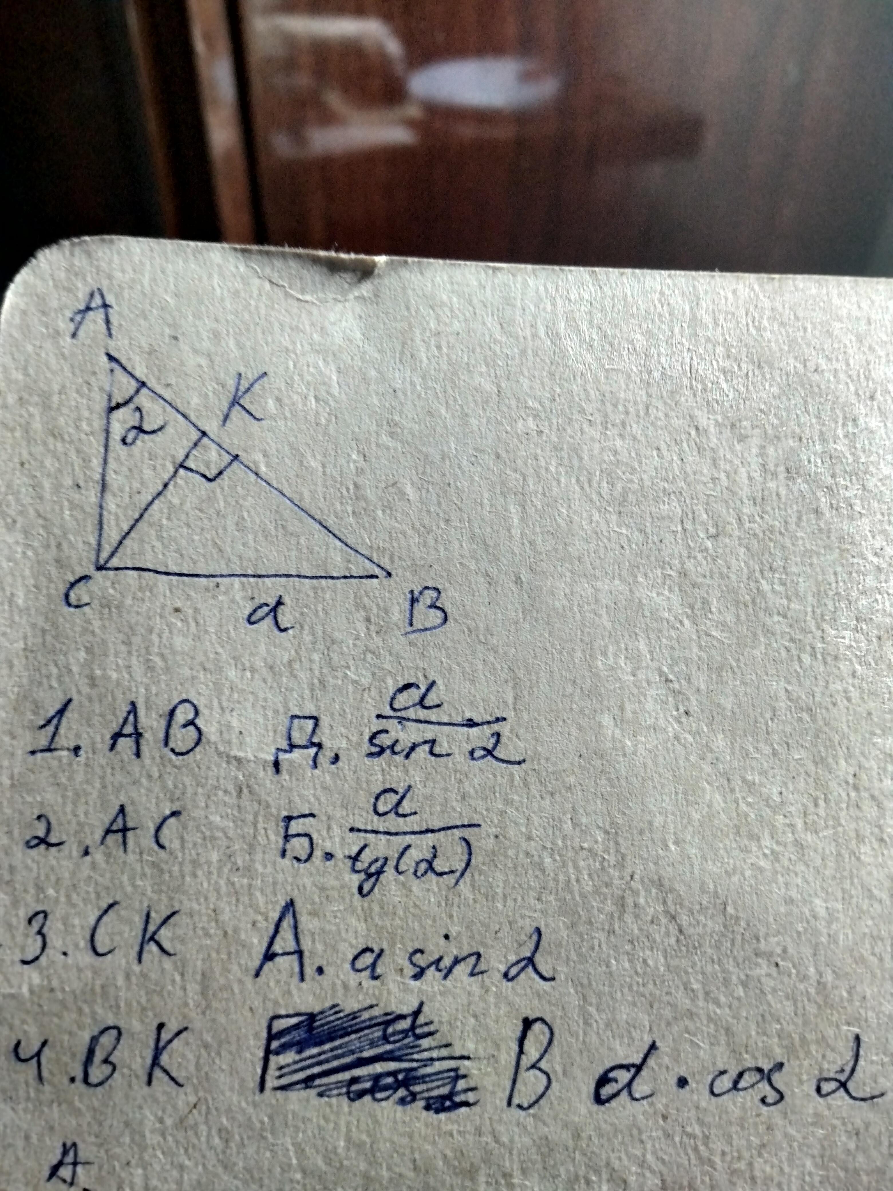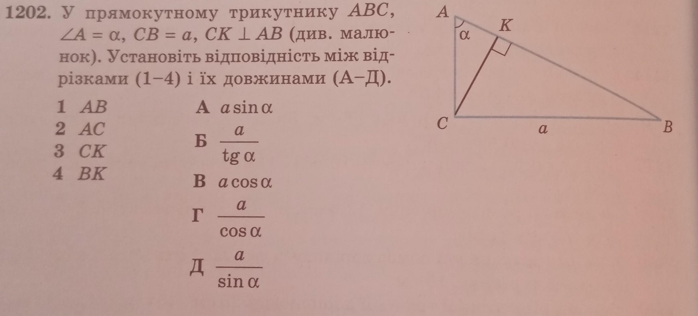 У прямокутному трикутнику ABC, ZA = = a, CB = a, CK | AB (див. малю- нок). Установіть відповідність між від- різками (1-4) і їх довжинами (А-Д). 1 AB A asina 2 AC a Б 3 CK tg a 4 BK B a cosa a Г COS a a Д sin a A с a K a В