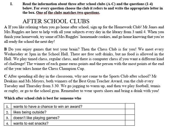 1. Wants to have a chance to win an award - B (Chess Club) (так как есть шанс выиграть кубок)
