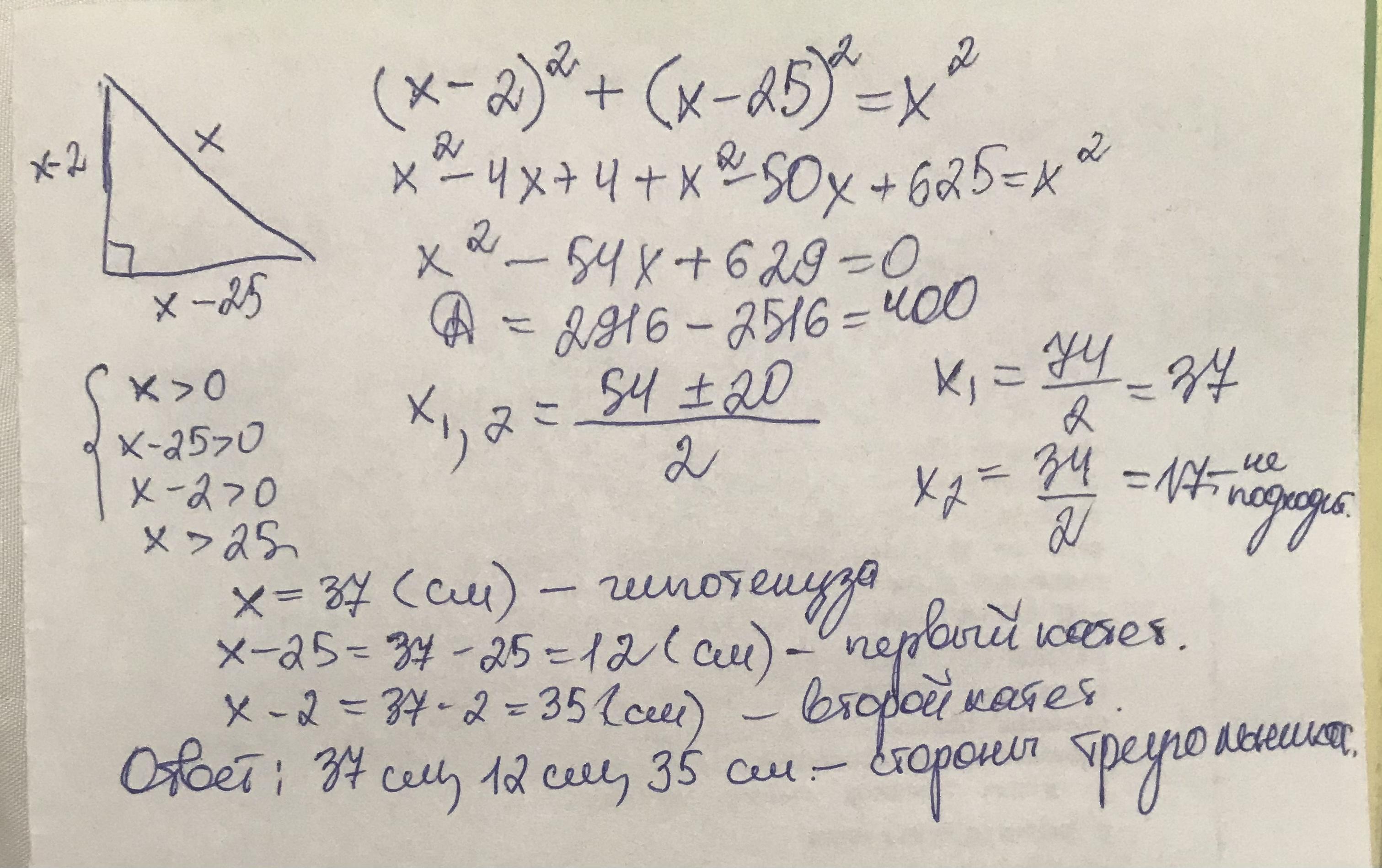 1. (1 балл) В прямоугольном треугольнике один из катетов на 2 см меньше гипотенузы, а другой – на 25 см меньше гипотенузы.
