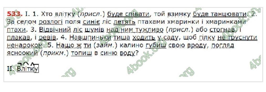Спишіть речення, розкриваючи дужки й розставляючи пропущенi роз ділові знаки. Підкресліть члени речення. 1. Хто (в)літку буде співати той (у)зимку буде танцювати (Нар. творчість). 2. За селом розлогі поля синіє лiс л(е,и)тять птахами хмаринки і хмаринками птахи (У. Самчук). 3. Вiд вічний ліс шумів над ним тужливо або стогнав і плакав i р(е,и) Вİв (І. Франко). 4. Навшпиньки тиша ходить у саду щоб гілку не труснути ненароком (Г.Дудка). 5. Нащо ж ти калино губиш свою вроду погляд ясноокий топ(е,и)ш в синю воду? (О. Довго п'ят). II. Визначте частини мови виділених слів.