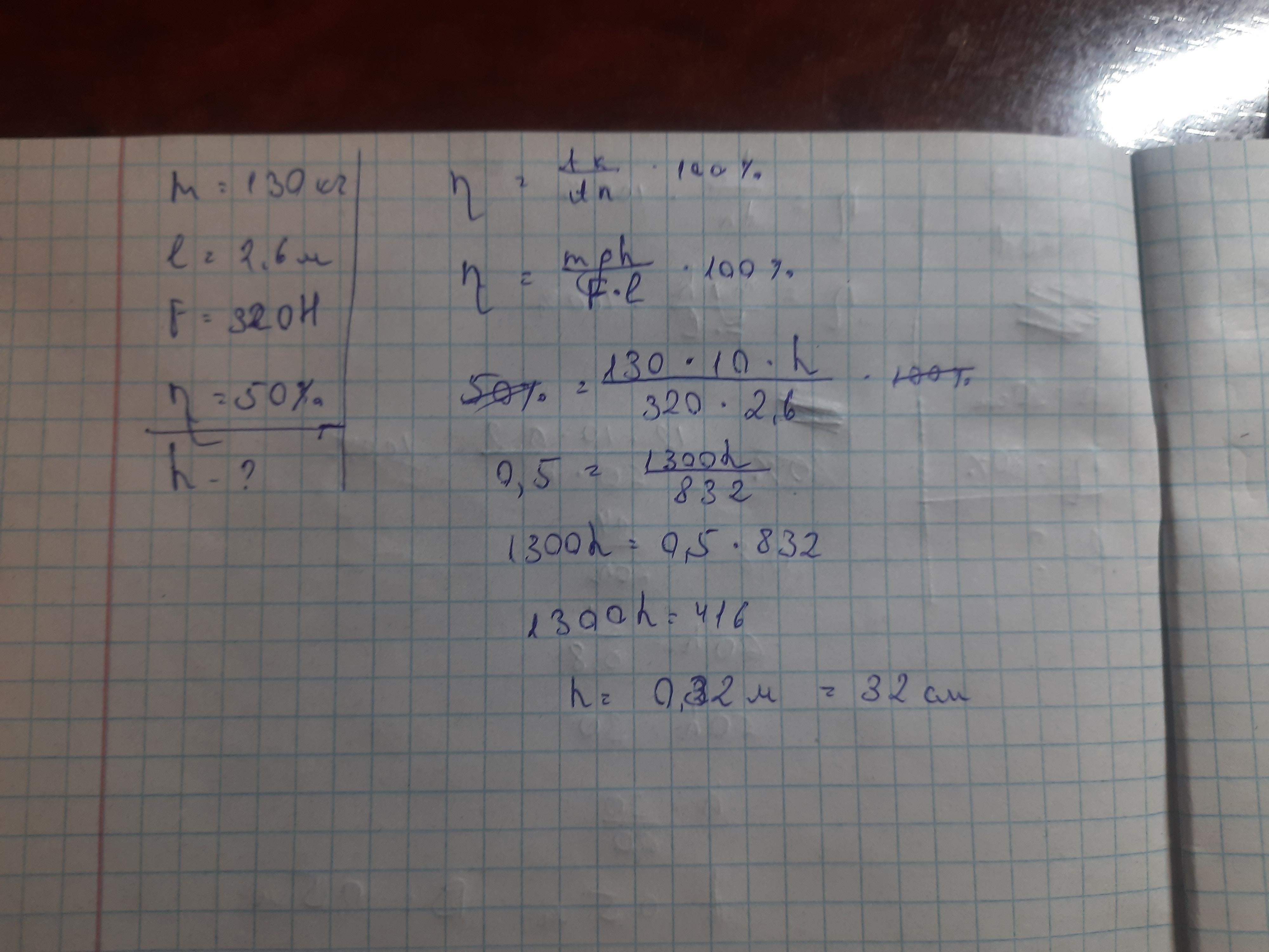 Вантаж масою 130 кг піднімають по похилій площині довжиною 2,6 м, прикладаючи силу 320 Н. Якою є висота похилої площини, якщо ККД=50%.