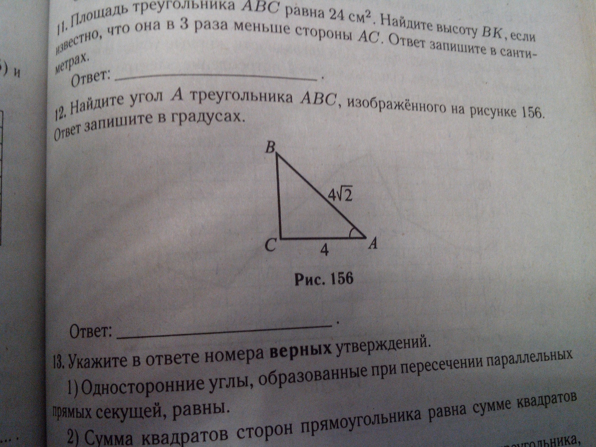 №1 обозначим точки - 1 - левая, 2 - нижняя , 3- верхняя, рассмотрим линию 1-2 как диагональ прямоугольника со сторонами 3 и 1, диагональ1=корень(9+1)=корень10, рассмотрим линию 2-3 ка диагональ прямоугольника со сторонами 2 и 6, диагональ 2=корень(4+36)=корень40, рассмотрим линию 1-3 как диагональ прямоугольника (квадрата) со сторонами 5 и 5, диагональ 3=корень(25+25)=корень50, рассмотрим треугольник 123, если сумма квадратов двух сторон=квадрату больше стороны то треугольник прямоугольный, диагональ1 в квадрате+диагональ2 в квадрате=10+40=50, диагональ3 в квадрате=50, треугольник прямоугольный угол2=90, №2 ВС=корень(АВ в квадрате-АС в в квадрате)=корень(32-16)=4, треугольник АВС прямоугольный равнобедренный, уголА=уголВ=90/2=45, или cosA=АС/АВ=4/4*корень2=корень2/2 или 45 град