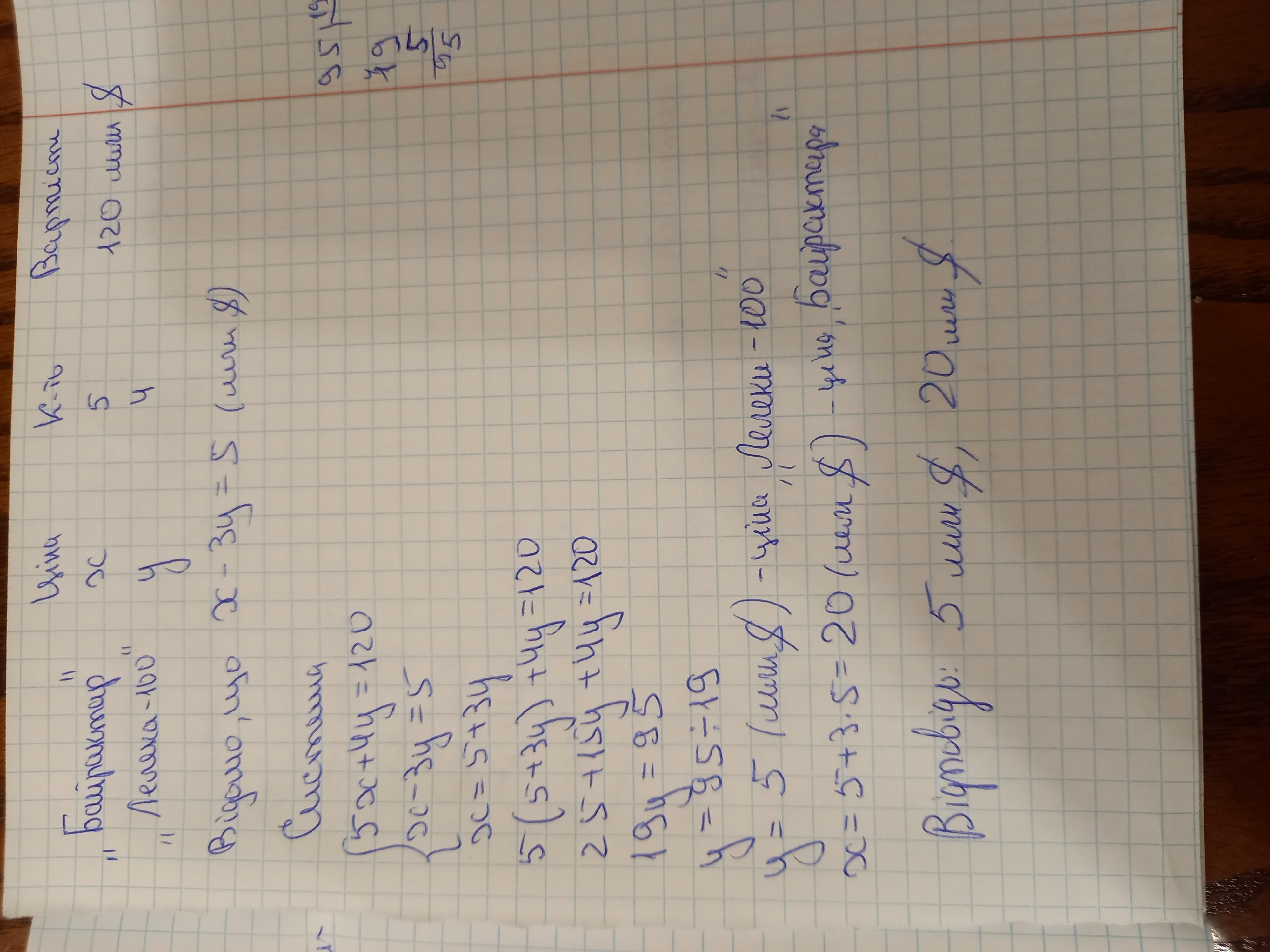 За 5 безпілоків "Байрактар" та 4 безпілотники "Лелека-100" волонтери заплатили 120 млн доларів. Скільки коштує 1 "Байрактар" та 1 "Лелека-100" , якщо 1 "Байрактар" дорожчий за 3 "Лелека-100" на 5 млн доларів?