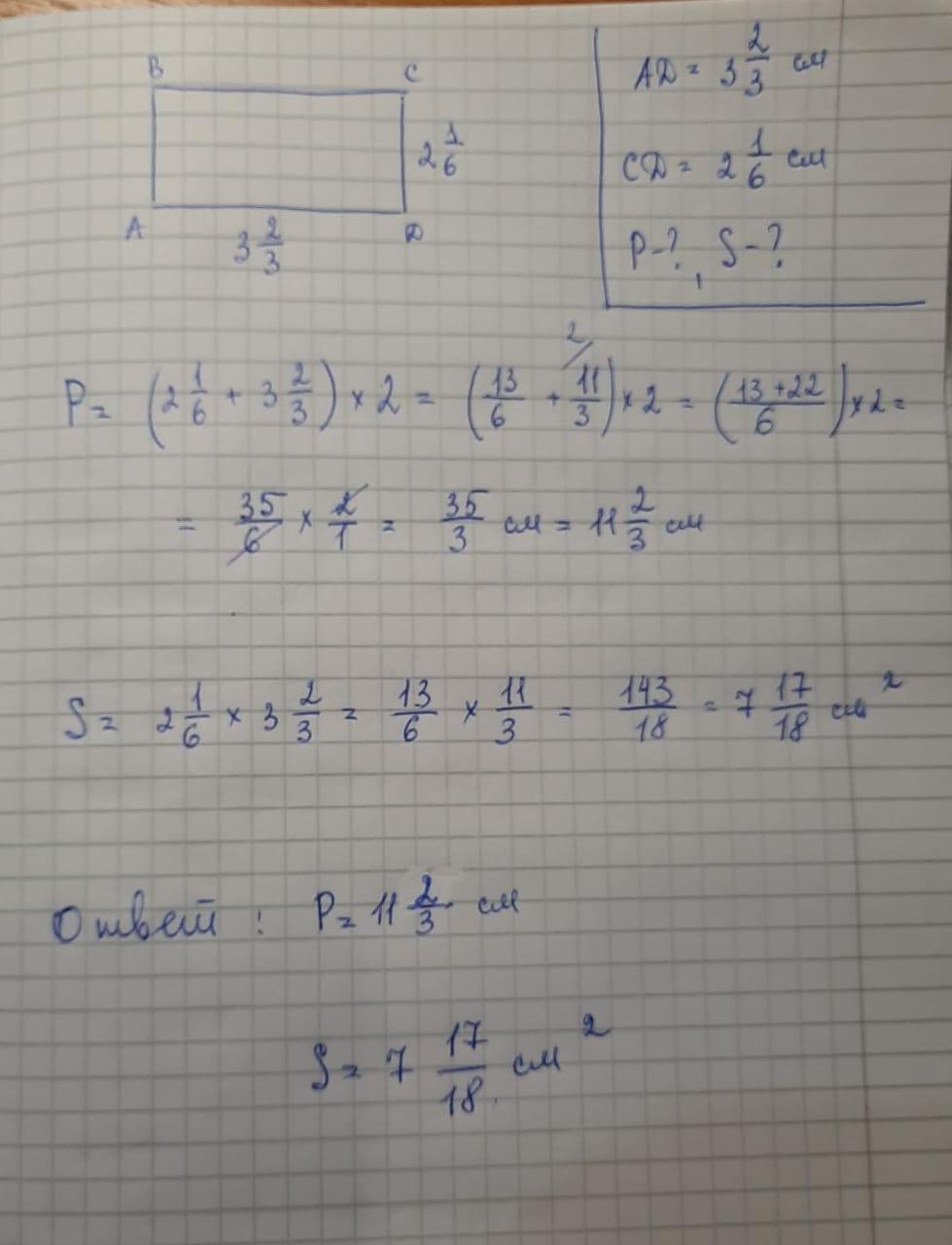 Вычислите площадь и периметр прямоугольника длина и ширина которого равны 2 целых 1/6 и 3 целых 2/3