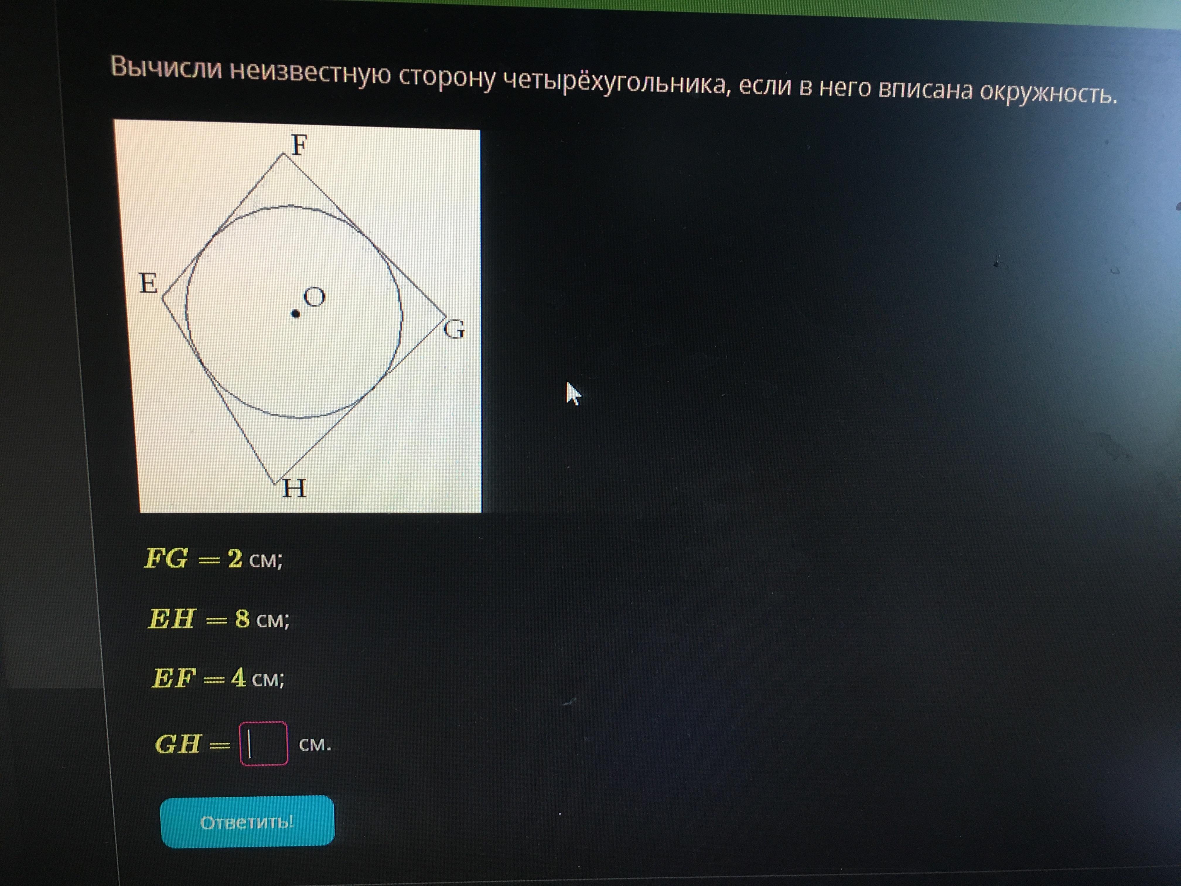 Сумма противоположных сторон четырехугольника,описанного вокруг окружности,равна сумме других противоположных сторон; GH+EF=FG+EH;