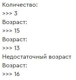 Программа считывает количество участников и возраст каждого из них. Если возраст кого-то меньше 14 лет, программа печатает «Недостаточный возраст». Оформи программу как на картинке.