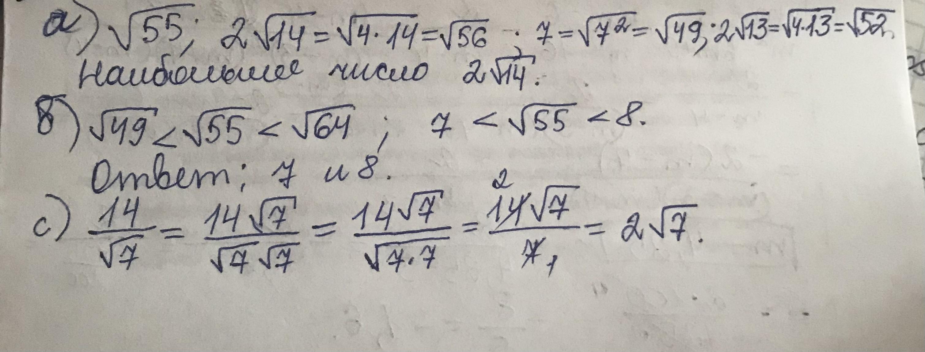 17. а) Найдите наибольшее из чисел: √55; 2√14; 7; 2√13. b) Найдите два последовательных натуральных чисел, между которыми расположено число √55. 14 с) Освободитесь от иррациональности в знаменателе П [1] [1] [1]