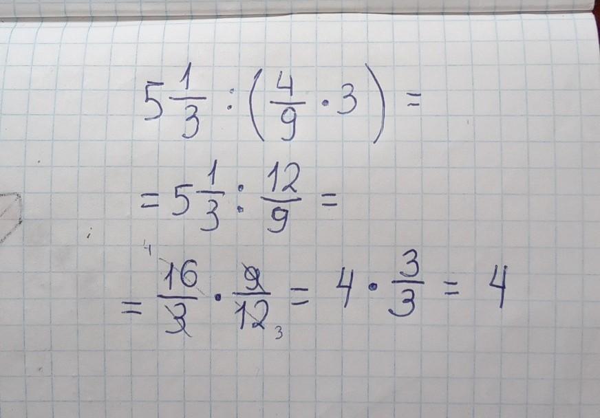 5 1/3:(4/9*3) = 16/3 ÷ 4/3 = 16/3×3/4=4