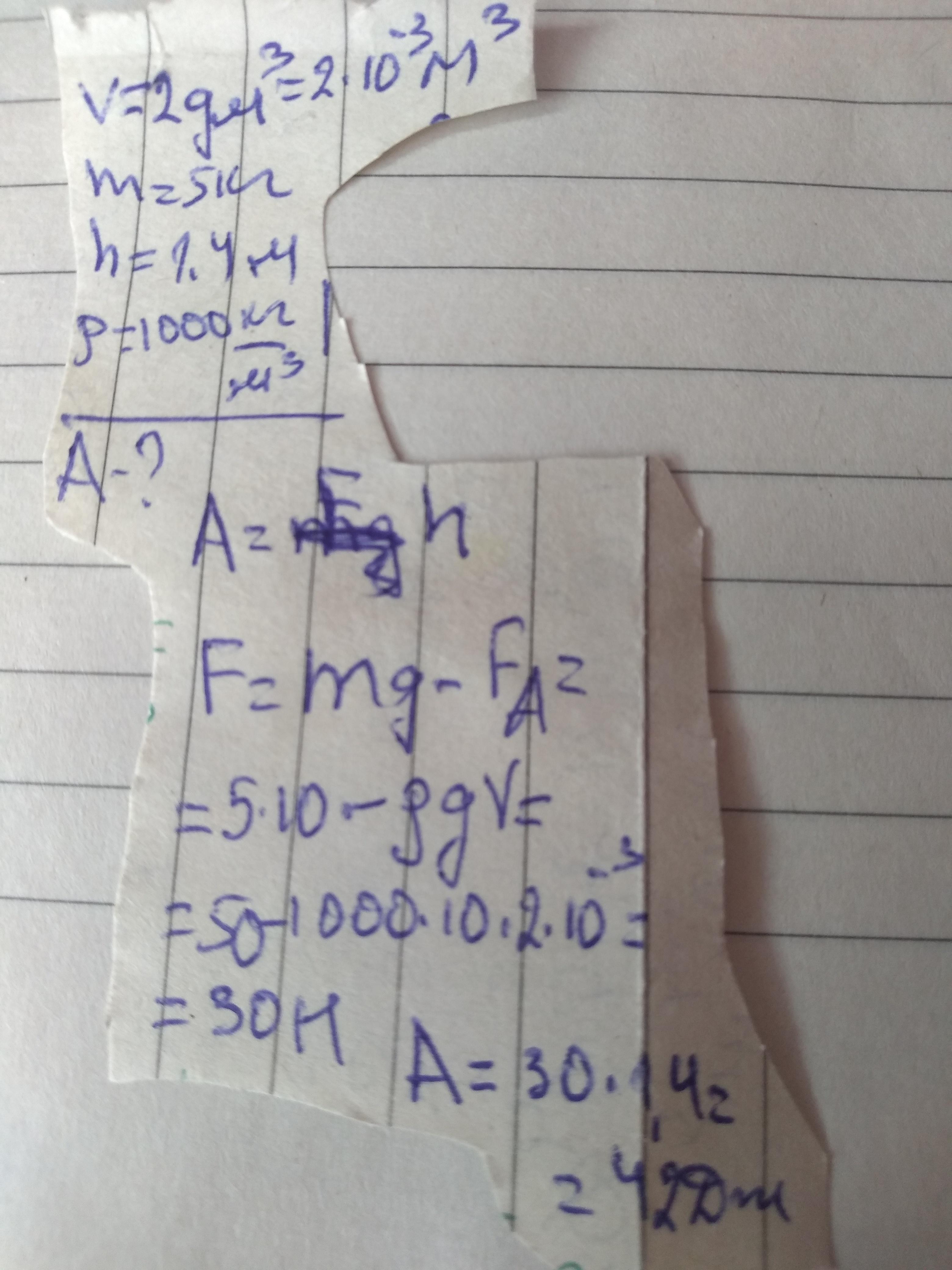 Яку роботу треба виконати, щоб підняти із дна річки до поверхні води камінь об'ємом 2 дм3, маса якого 5 кг ? Глибина (3 бали) річки дорівнює 1,4 м. Густина води 1000 кг/м3.