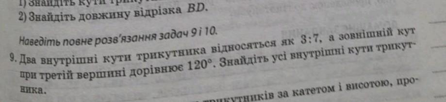 Нехай одна частина кута - х° , тоді відношення частин 3х і 7х. Сума цих кутів дорівнює зовнішньому куту при третій вершині, тобто 120° Складемо рівняння: