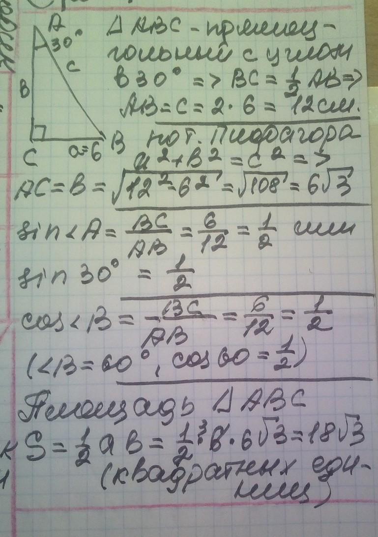 У прямокутному трикутникуАВС кут С=90градусів, а=6, кутА=30 градусів.Знайти в, с , синус кута А, косинус кута В,площу трикутника АВС.