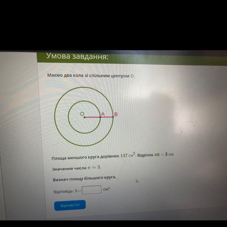 Маємо 2 кола з спільним центром площа меншого круга дорівнює 147 сантиметрів квадратних відрізок АB = 3 сантиметри значення числа Пі дорівнює 3 визначте площу більшого, даю максимум балов!