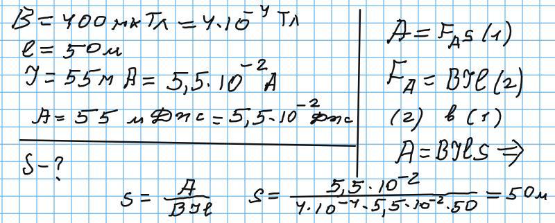 В однорідному магнітному полі індукцією 400 мкТл на прямолінійний провідник довжиною 50 м зі струмом 55 мА діє сила Ампера. Визначити на яку відстань перемістився б провідник, якби магнітне поле виконало роботу 55 мДж.