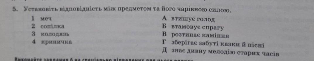 У завданні 5 необхідно встановити відповідність інформації. До кожного рядка, позначеного цифрою, доберіть вiдповiдник, позначений буквою. Упишіть відповіді в таблицю 5. Установіть вiдповiднiсть між предметом та його чарівною силою. 1 А ВТишує голод 2 1 меч 2 сопілка Б втамовує спрагу 3 3 колодязь в розтинає каміння 4 криничка Г зберігає забуті казки й пiснi 4 Д знає дивну мелодію старих часів 2 балк