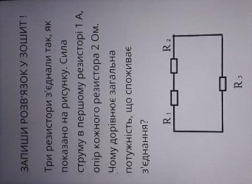 Три резистори з'єднали так, як показано на рисунку. Сила струму в першому резисторі 1 A, опір кожного резистора 2 Ом. Чому дорівнює загальна потужність, що споживае з'єднання? R2 R1 R 3