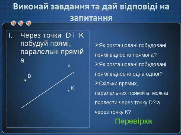 Через точки D і K побудуй прямі паралельні прямій А. Відповісти на запитання після вирішення