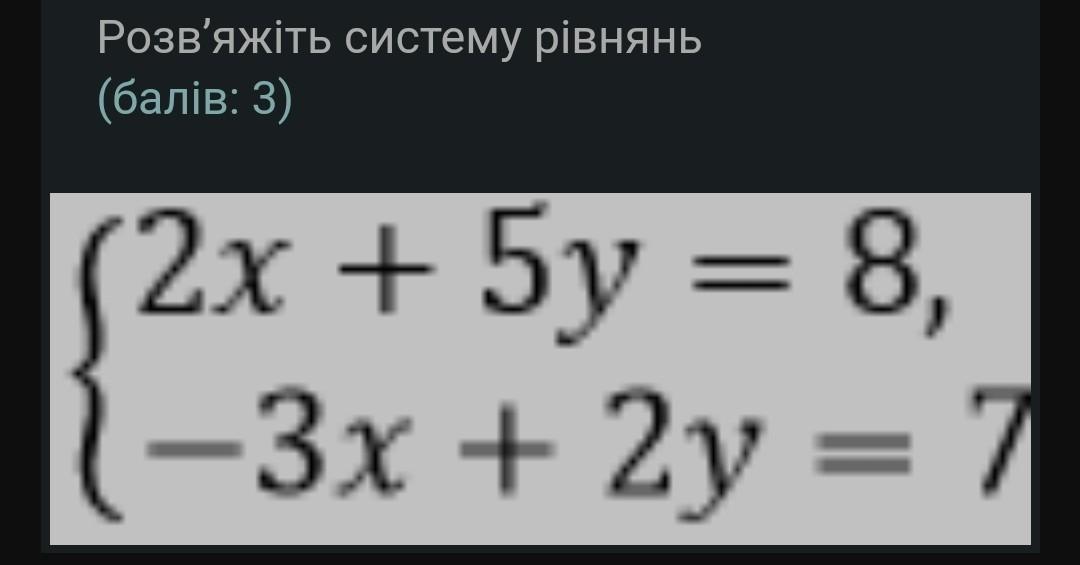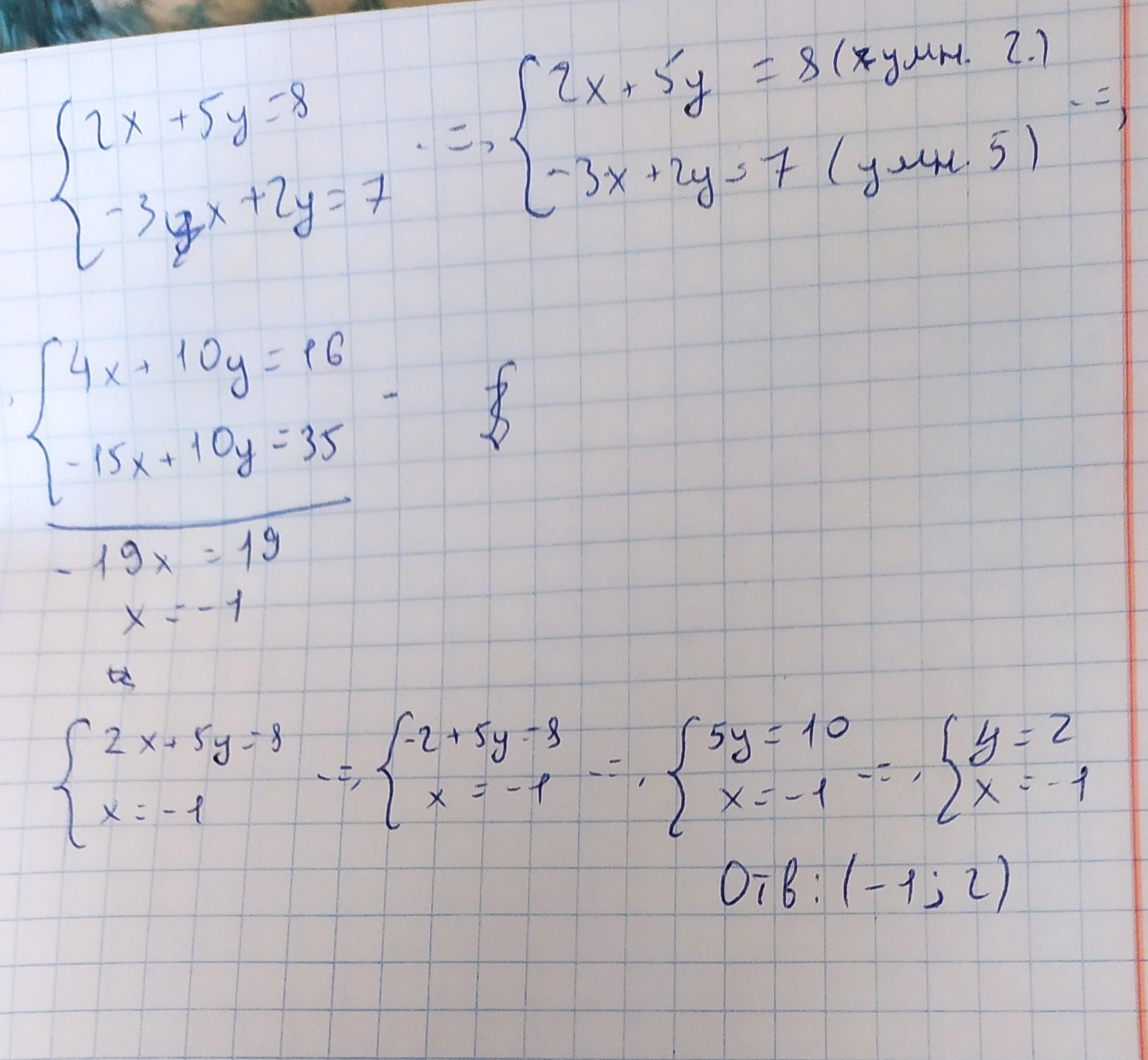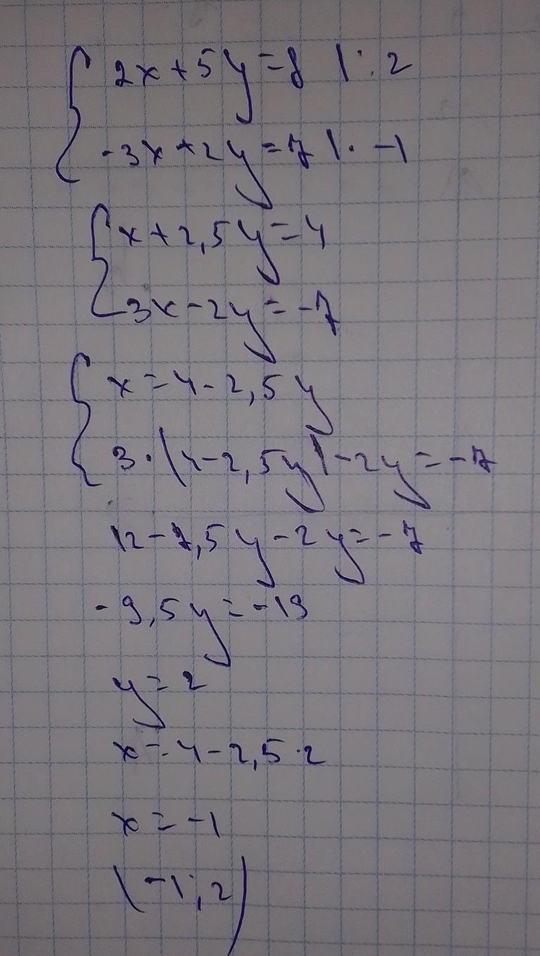 1 умножим на 3, 2 на 2, сложим. 15у+4у=24+14; у=2; 2х+10=8; х=-1;