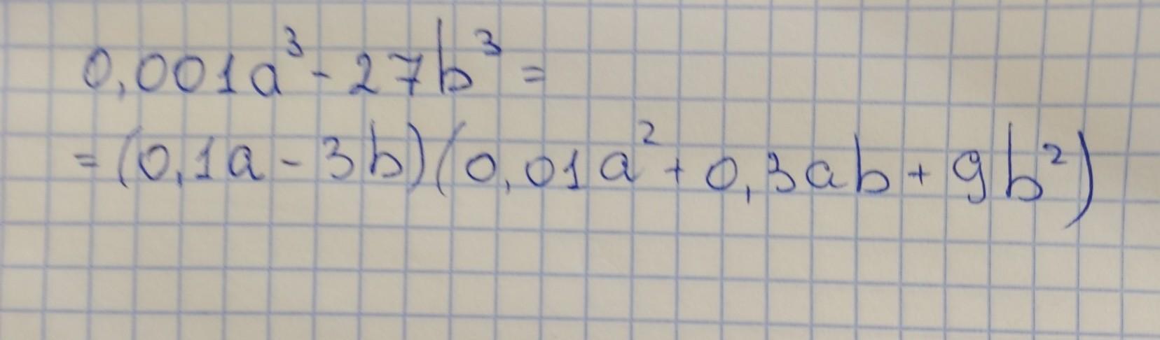 0,001a³-27b³=(0,1a)³-(3b)³=(0,1a-3b)(0,01a²+0,03ab-9b²)