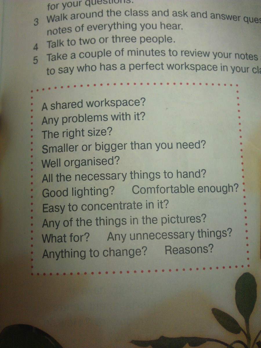 помогите составить вопросы,пожалуйста с помощью вот этих слов. Тема моя комната. например 1) do you share workspace?