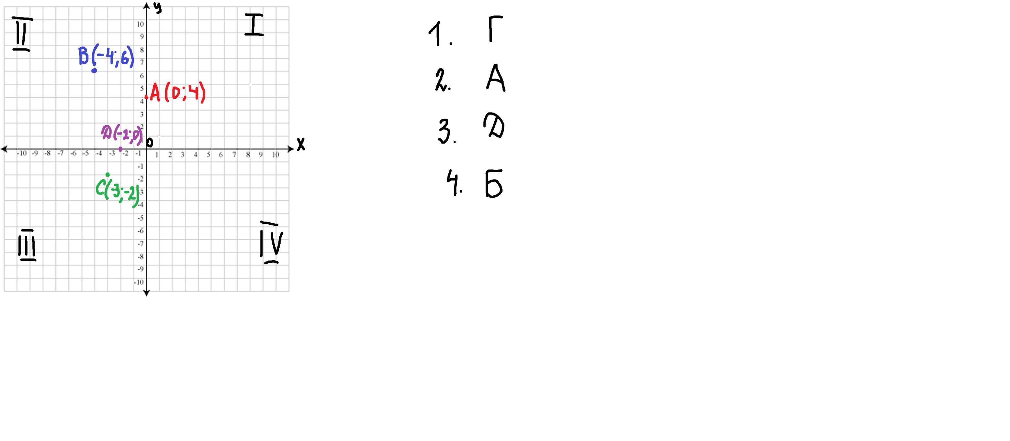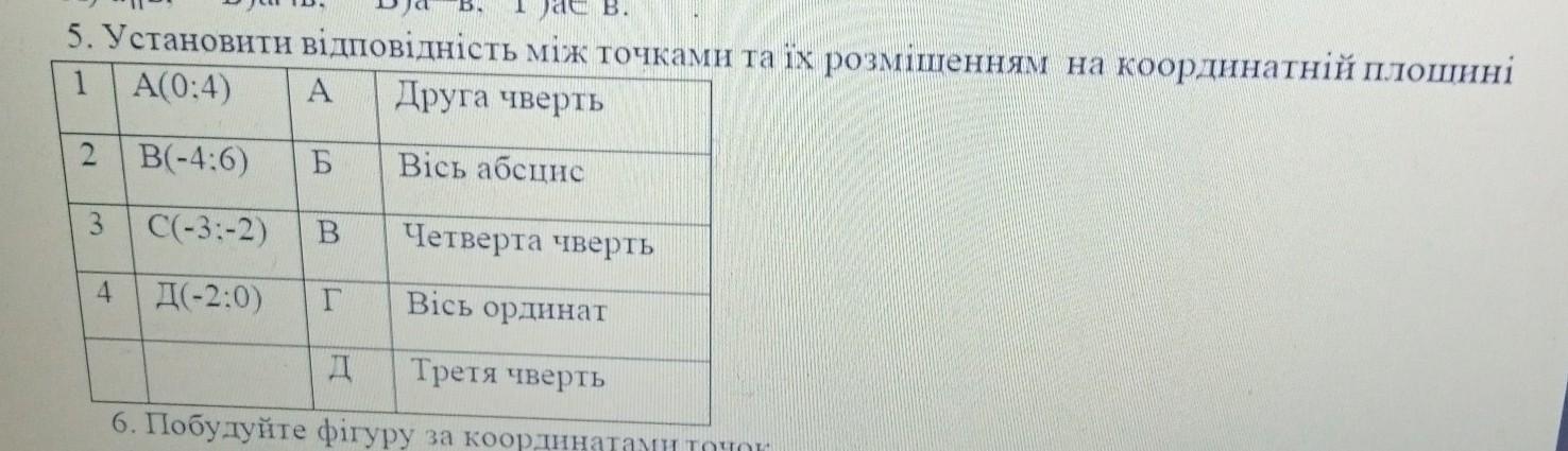 1 A(0:4) 2 | B(-4:6) 3 C(-3:-2) 4 Д(-2:0) A Друга чверть Б Вісь абсцис B Четверта чверть Г Вісь ординат Д Третя чверть