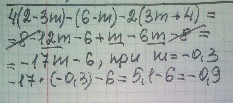 4(2 - 3m) - (6 - m) - 2(3m + 4) =