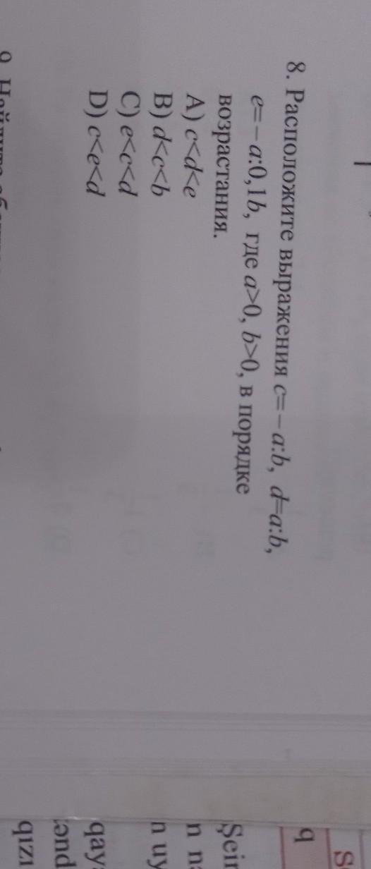 мы знаем, что чем меньше делитель, тем больше частное, но так же не забываем о том, что у нас перед частным -a:0.1b стоит знак минус, следовательно на первое место мы его поставить не можем. Из трёх выражений есть лишь одно выражение с положительными знаками - d=a:b
