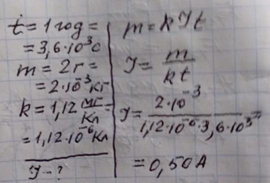 Під час сріблення виробу за 1 год на катоді виділилося 2 г срібла. Якою приблизно була сила струму в процесі сріблення?Електрохімічний еквівалент срібла 1, 12мг/Кл.ПРОШУ ДОПОМОЖІТЬ !!!!