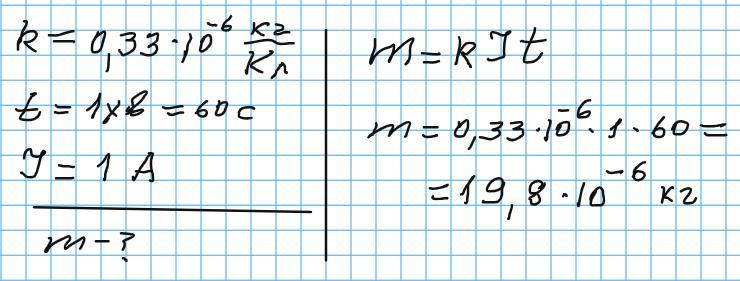 Яка маса міді (k=0,33⋅10-6 кг/Кл) виділиться під час електролізу , якщо за 1 хв через розчин проходить струм 1 А