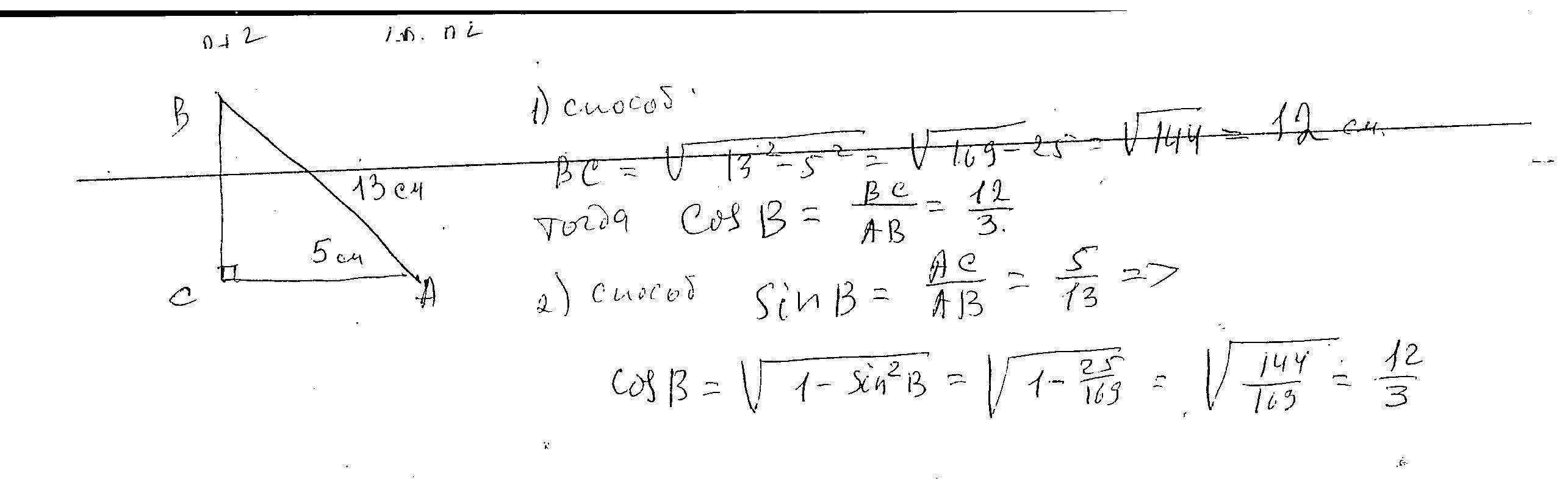 Катет AC прямокутного трикутника ABC дорівнює 5см, а гіпотенуза AB 13 см. Знайдіть косинус кута B. Варіанти відповідей: A) 5/12. Б) 5/13. B) 12/13. Г) 13/12. Розв'язок будь-ласка.