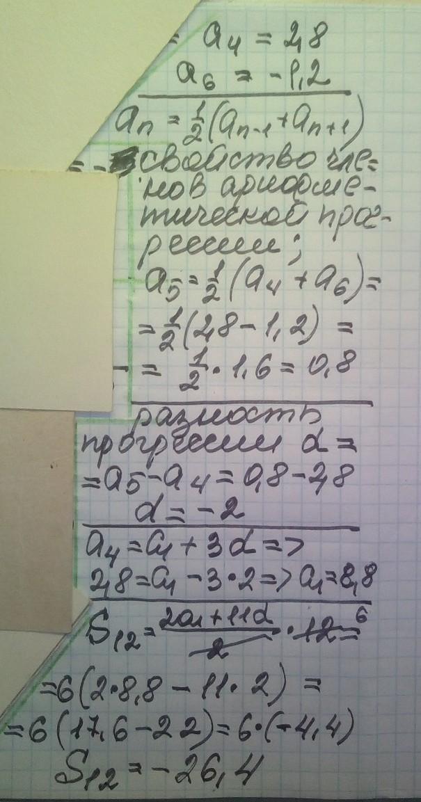 знайдіть суму перших дванадцяти членів арифметичної прогресії ,якщо їх четвертий член дорівнює 2,8 ,а шостий -1,2