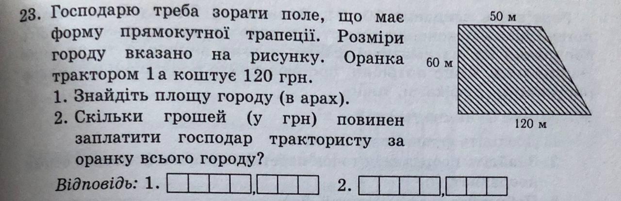 Господарю треба зорати поле, що має форму прямокутної трапеції. Розміри городу вказано на рисунку. Оранка трактором 1 а коштує 120 грн. 1. Знайдіть площу городу (в арах). 2. Скільки грошей (у грн) повинен заплатити господар трактористу оранку всього городу?