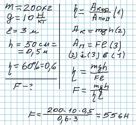4.3 якою силою тiло рівномірно підіймають по похилій площині , якщо маса тіла - 200 кг . довжина похилоï площини - 3 м , висота - 50 см , а ККД дорівнює 60 % ?