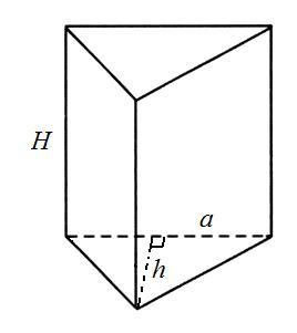 СРОЧНО ПОМОГИТЕ, ПОЖАЛУЙСТА Найди площадь полной поверхности и объем прямой треугольной призмы, если даны высота һ и основание a треугольника, лежащего в основании, а также высота Н этой призмы.