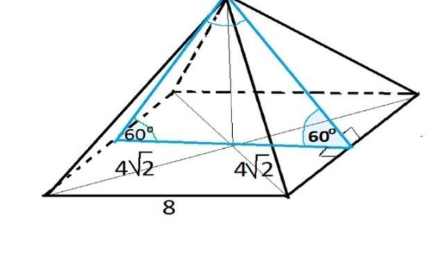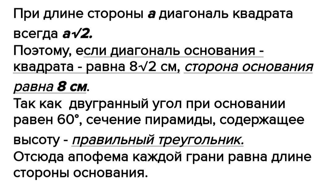 В правильной четырехугольной пирамиде диагональ основания равна 8√2 см,