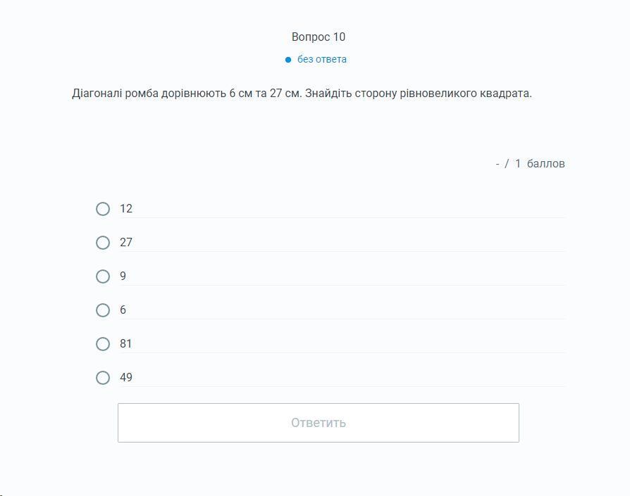 діагоналі ромба дорівнюють 6 см та 26 см. знайдіть сторону рівновеликого квадрата