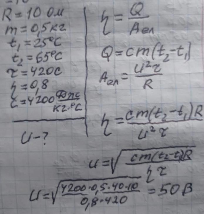 З допомогою нагрiвника опором 10 Ом воду масою 0,5 кг нагріли від 25 До 65 °С за 7 хв. Визначте (у вольтах) напругу на клемах нагрiвника, якщо коефіцієнт його корисної дії становить 80 %. Питома теплоємність води дорівнює 4200 Дж/(кг. °C).