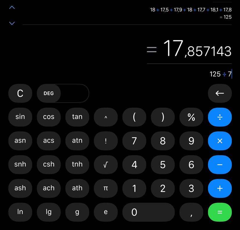 Упродовж тижня щоденні надої молока від однієї корови становили: 18 л, 17,5 л, 17,9 л, 18л, 17,7 л, 18,1 л, 17,8 л. Скільки літрів молока давала корова в середньому за один день. відповідь відповідь округліть до десятих.