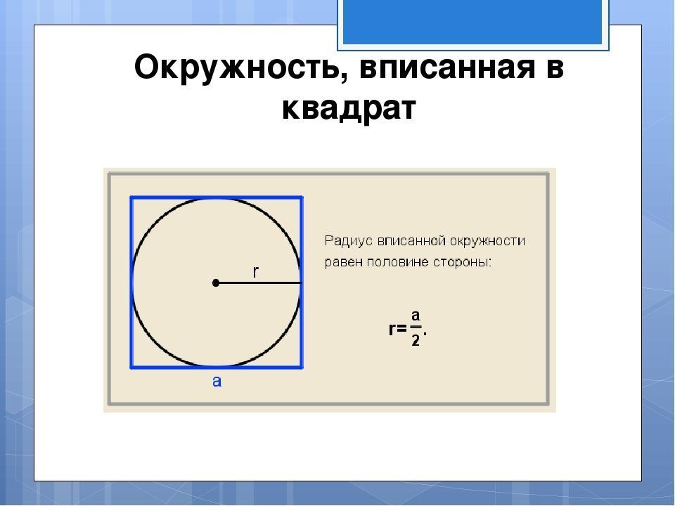 (на картинке показано, что радиус вписанной в квадрат окружности равен половине стороны квадрата)