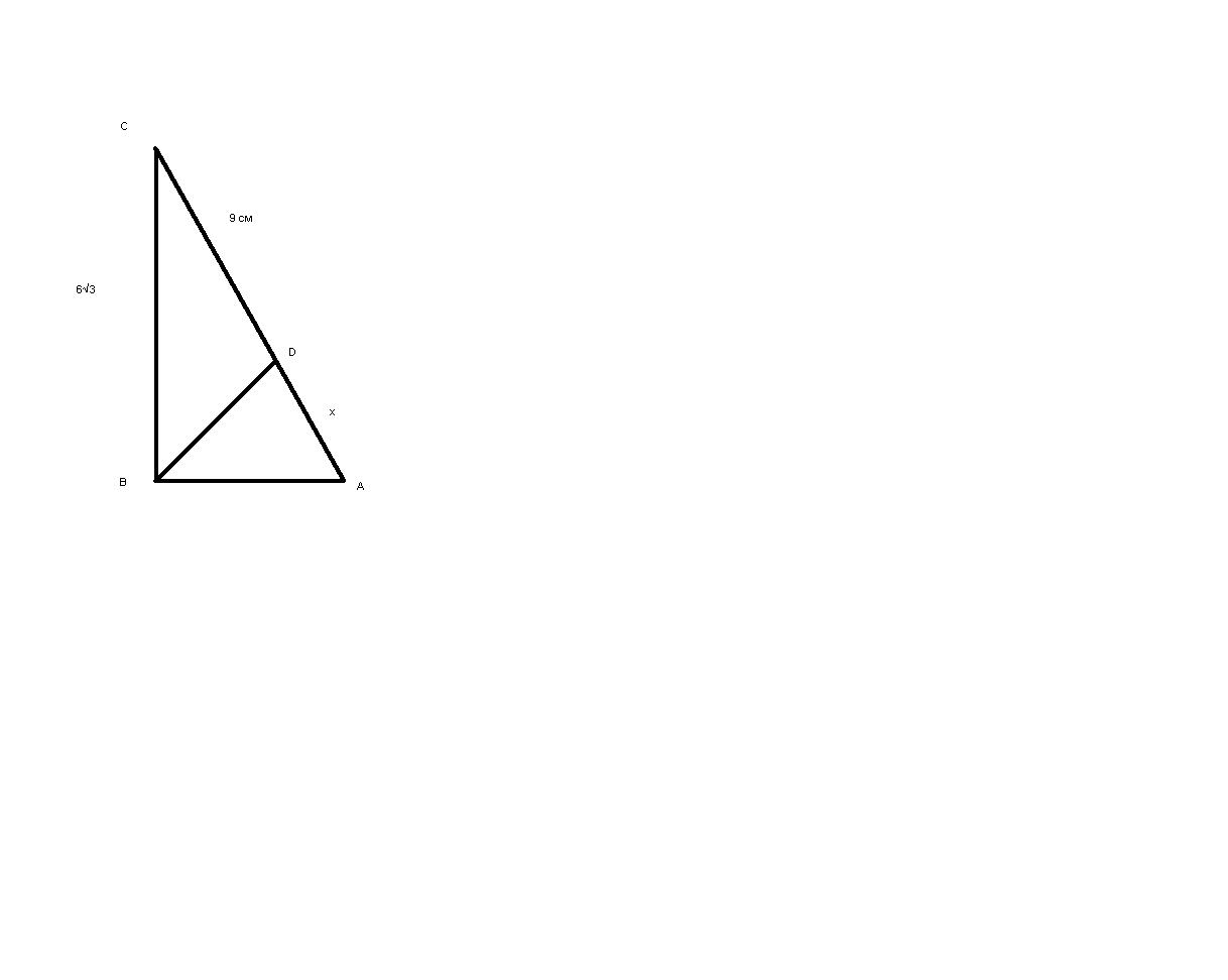 Найдите острые углы прямоугольного преугольника АВС, если высота ВD, проведённая к гипотинузе, отсекает от гипотинузы АС отрезок DC, равный 9см.; ВС=6√3см.