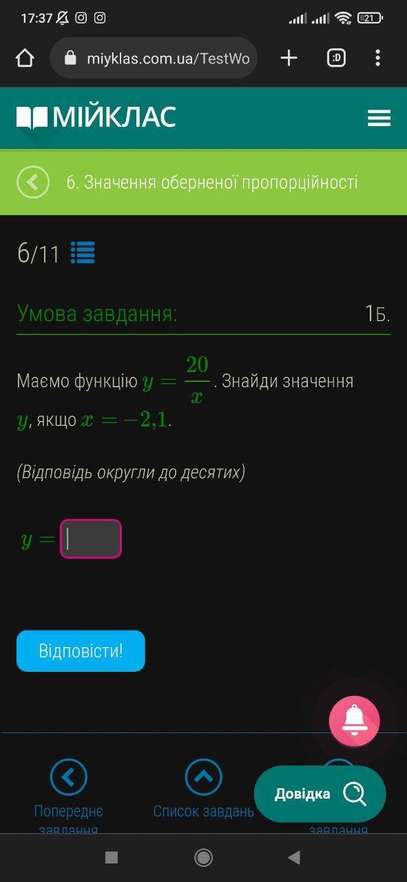 Маємо функцію y=20/x . Знайди значення y,якщо x= - 2,1.