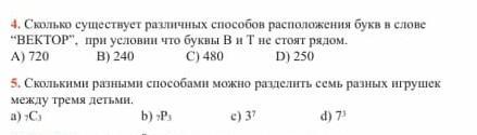 4а 1!6×5×4×3×2×1=720 комбинаций и слова вектор 2!4×3×2×1=24 комбинаций из букв Екор сочетание 3 сочетание Вт может занимать 5 мест в Екор в начале, конце,между буквами 3! 24×5=120 сочетаний,где с Вт 4! 720-120=600 сочетаний , где в Вт не стоят рядом. ответ 600