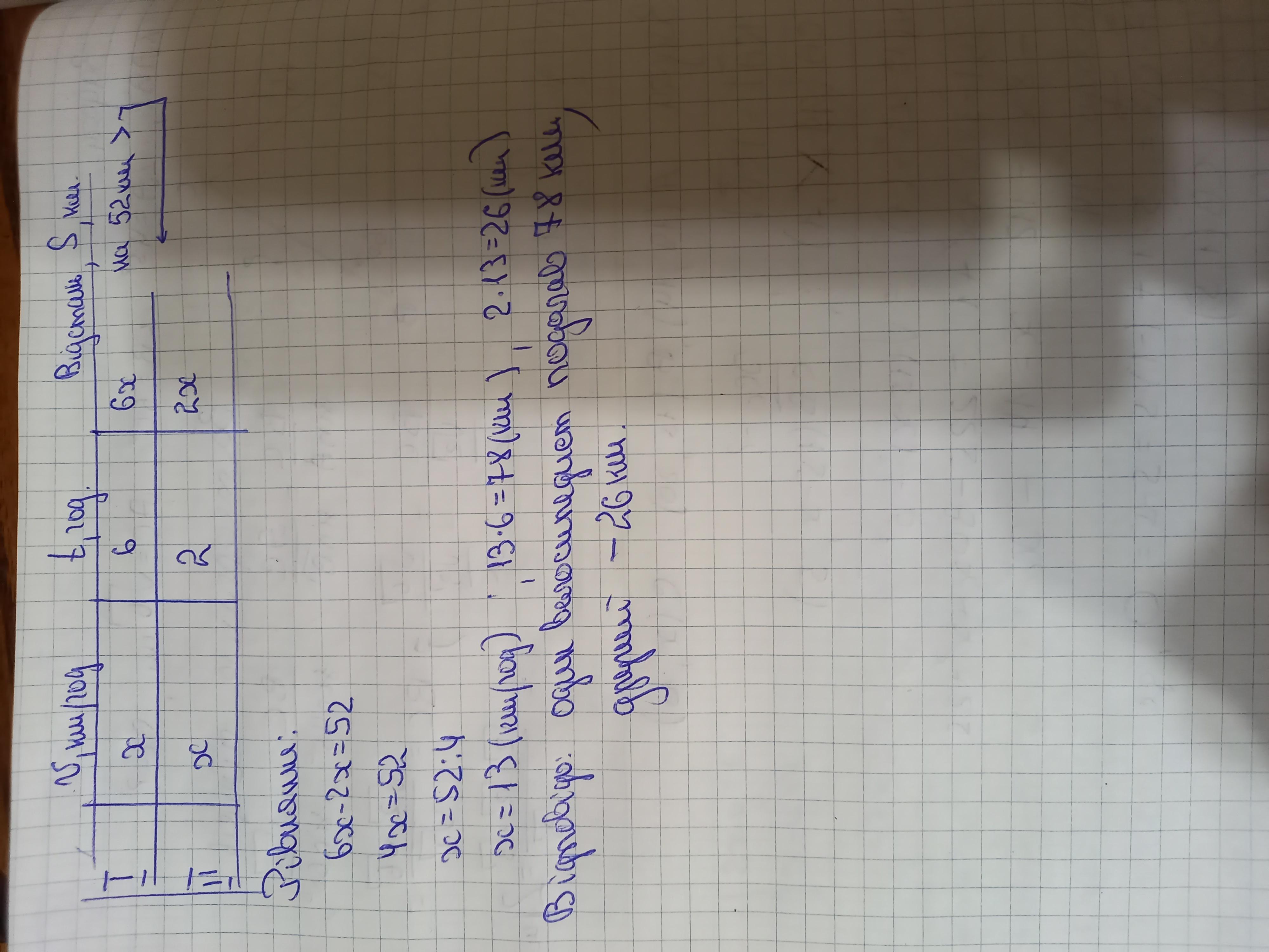 Два велосипедисти рухалися з однаковою швидкістю. Яку відстань подолав кожен з них,якщо один був у дорозі 6 год,а інший-2год, причому перший проїхав на 52 км більше,ніж другий