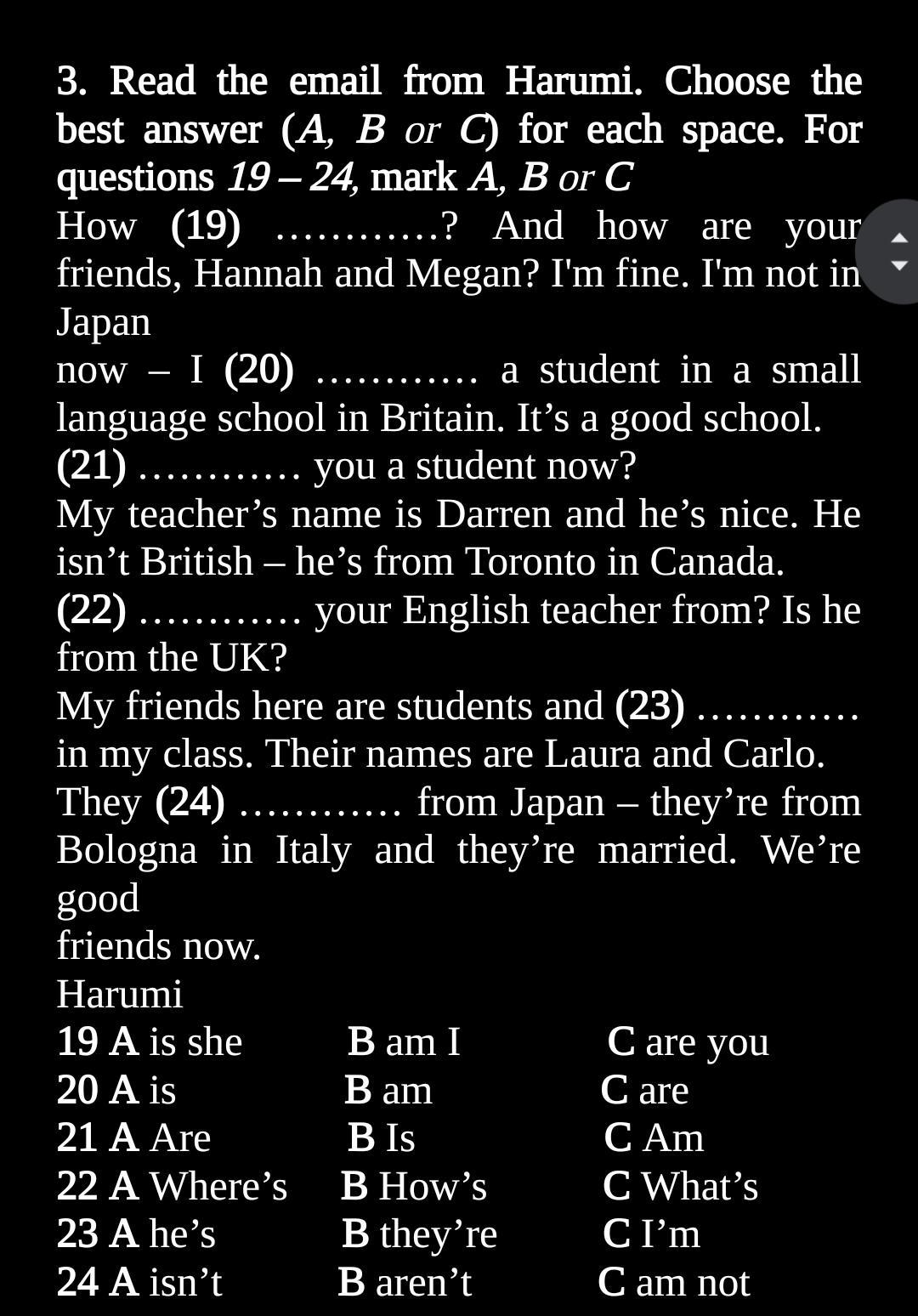 How are you? And how are your friends, Hannah and Megan? I'm fine. I'm not in Japan now – I am a student in a small language school in Britain. It’s a good school. Are you a student now? My teacher's name is Darren and he's nice. He isn't British - he's from Torronto in Canada. Where's your English teacher from? Is he from the UK? My friends here are students and they're in my class. Their names are Laura and Carlo. They aren't from Japan - they're from Bologna in Italy and they're married. We're good friends now. Harumi.