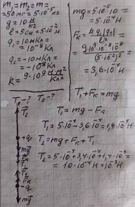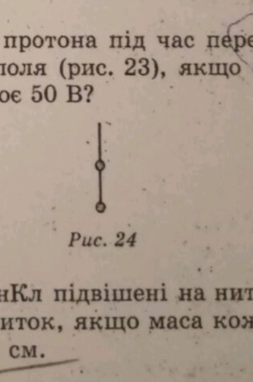 Дві однакові кульки із зарядами 10 i -10 нКл пiдвiшені на нитках (рис. 24). Знайдіть силу натягу кожної з ниток, якщо маса кожної кульки 50 мг, а довжина нижньої нитки 5 см.