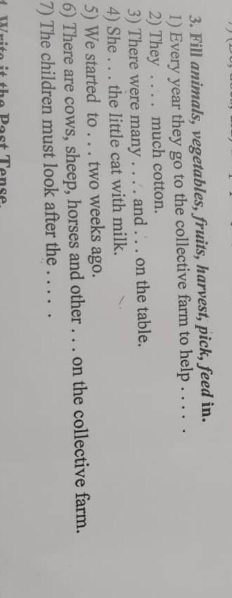 3. Fill animals, vegetables, fruits, harvest, pick, feed in.