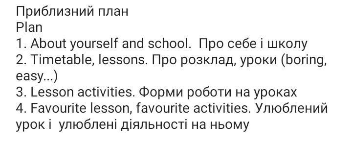 My name is (твоє ім'я), I study at school number(номер школи) in (номер класу та букву наприклад 7-А).On the monday we have math,it is intresting for me,but some times it's hard... (перераховуєш предмети і так з іншим днями тиждня).At each biology lessom,we have independent work(І так з кожним предметом,або з частиною).My favourite lesson is foreign literature,my favourite activities are when we talk about literary work and when we have conversation about characters or anything(Ось приклад,а ти напиши про свій улюблений предмет,якщо нема такогл пиши про будь-який)