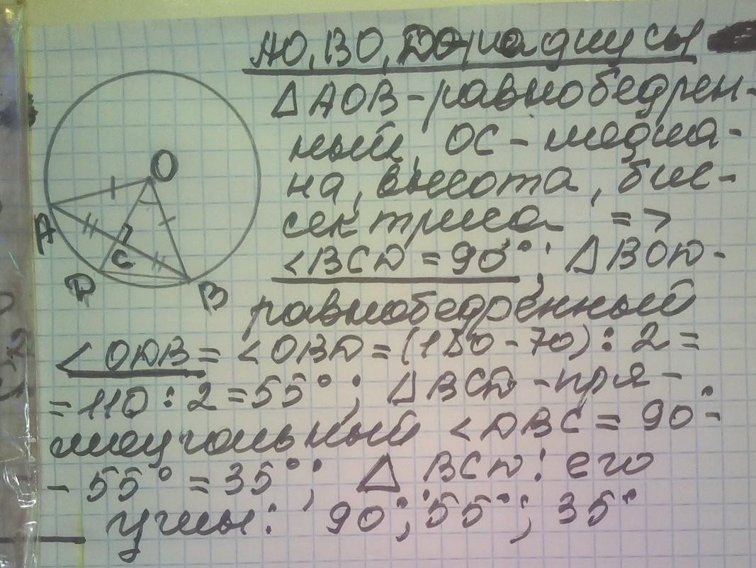 АВ – хорда с центром в точке О. В каком круге проведен радиус ОВ и радиус ОD, проходящий через середину отрезка АВ точку С. Угол ВОD = 70. Найти углы треугольника ВСD.