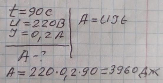 Яку роботу здійснить струм у єлектродвигуні за 90 С, якщо якщо при напрузі 220В сила струму о обмотці двигуна дорівнює 0,2 А.