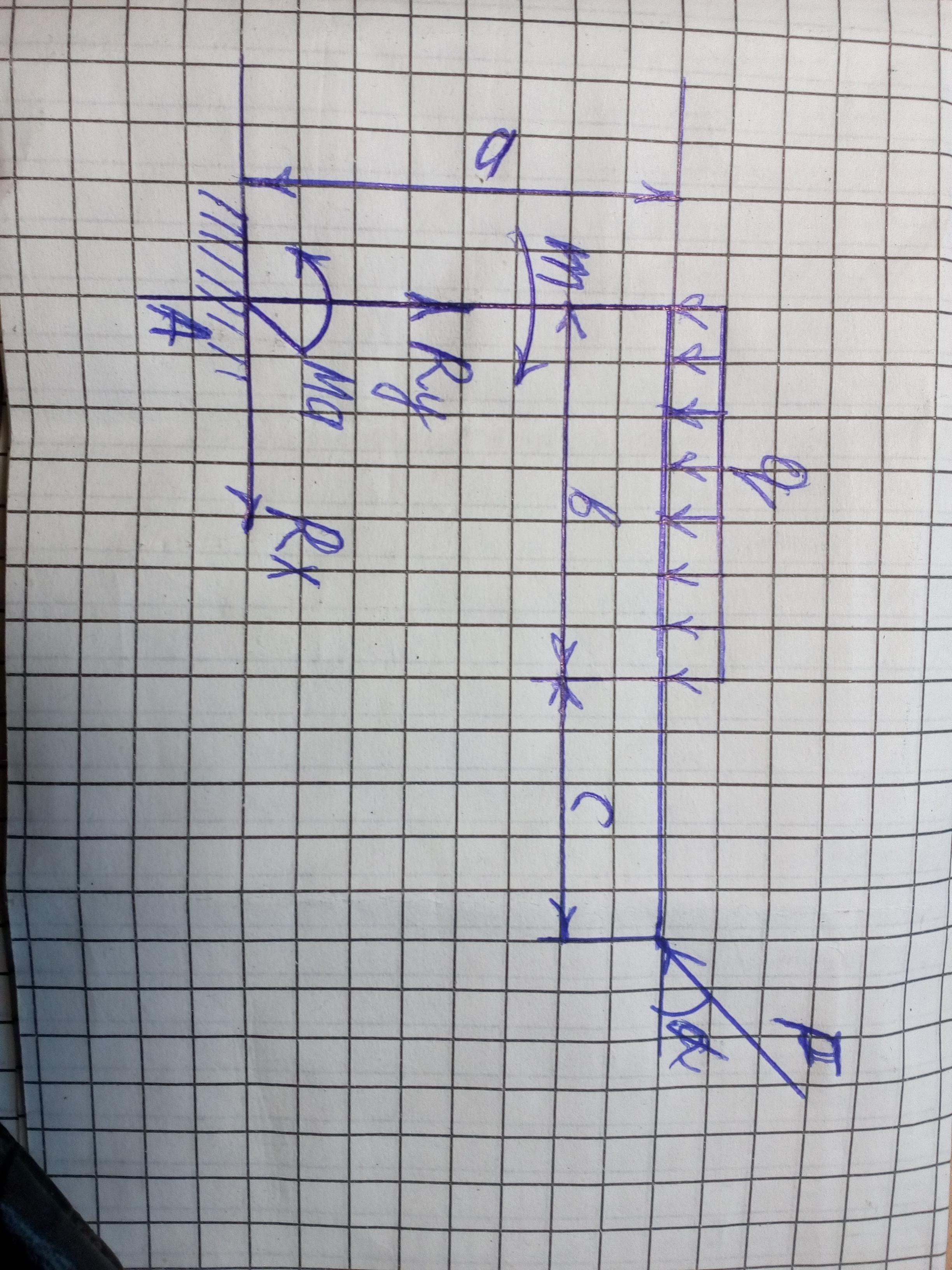 Жестко защемленная балка. Реакция опоры А будет по оси х Rx, по оси y Ry и удерживающий момент Ма.