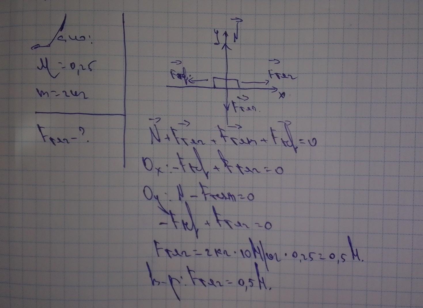 з якою силою треба рівномірно тягнути дерев'яний брусок по підлозі якщо коефіцієнт тертя дорівнює 0.25? маса бруска 2 кг? з розв'язанням будь ласка.